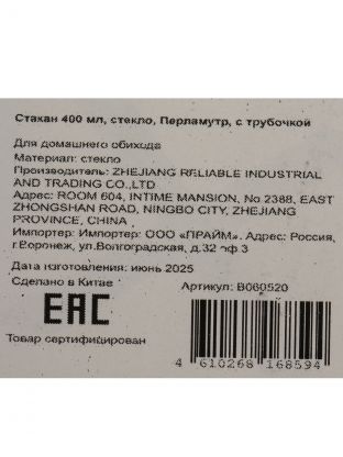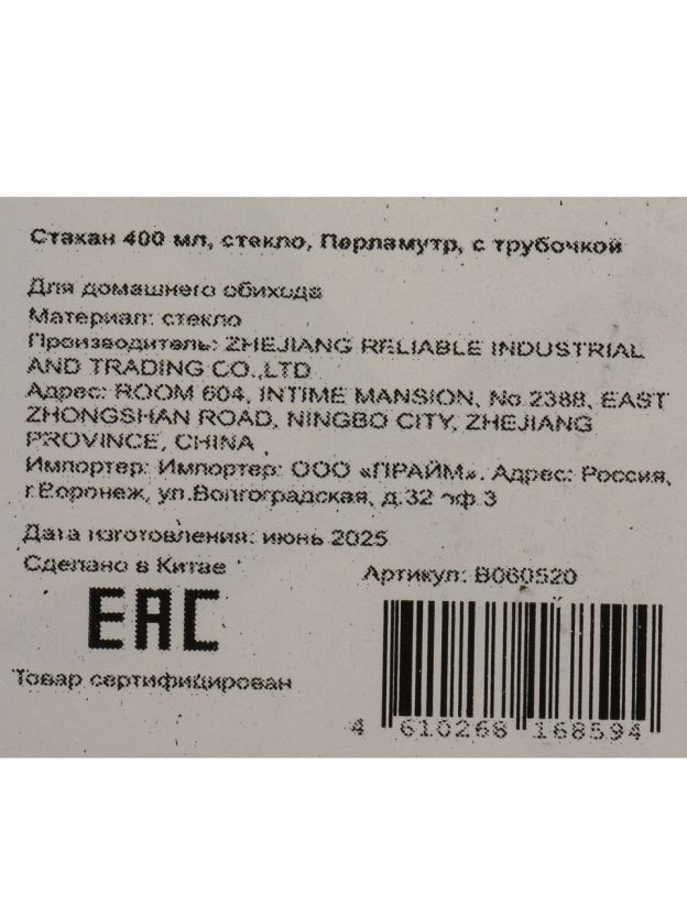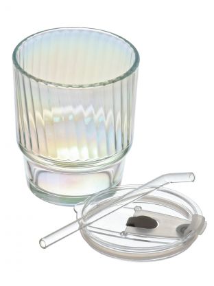 Стакан 400 мл, стекло, Перламутр, с трубочкой, B060520