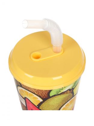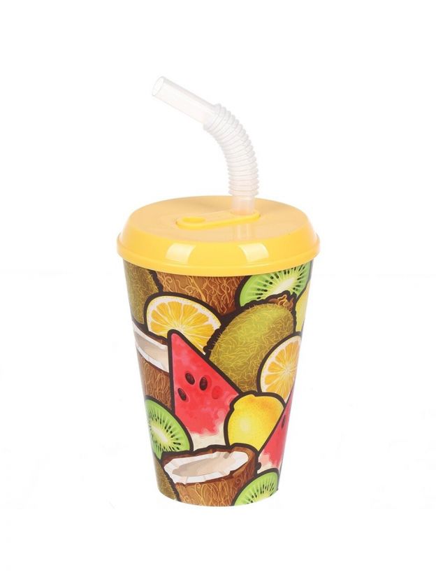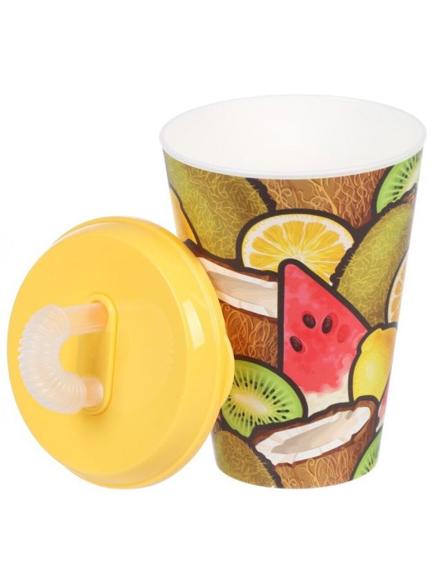 Объем стакана — 420 мл, материал — ударопрочный пластик, модель «Фрукты» с декором, в комплекте крышка и трубочка.