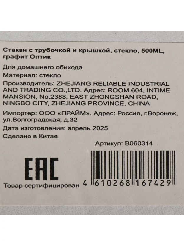 Стакан для напитков 500 мл, стекло, Оптик, с трубочкой, с крышкой, графит, B060314