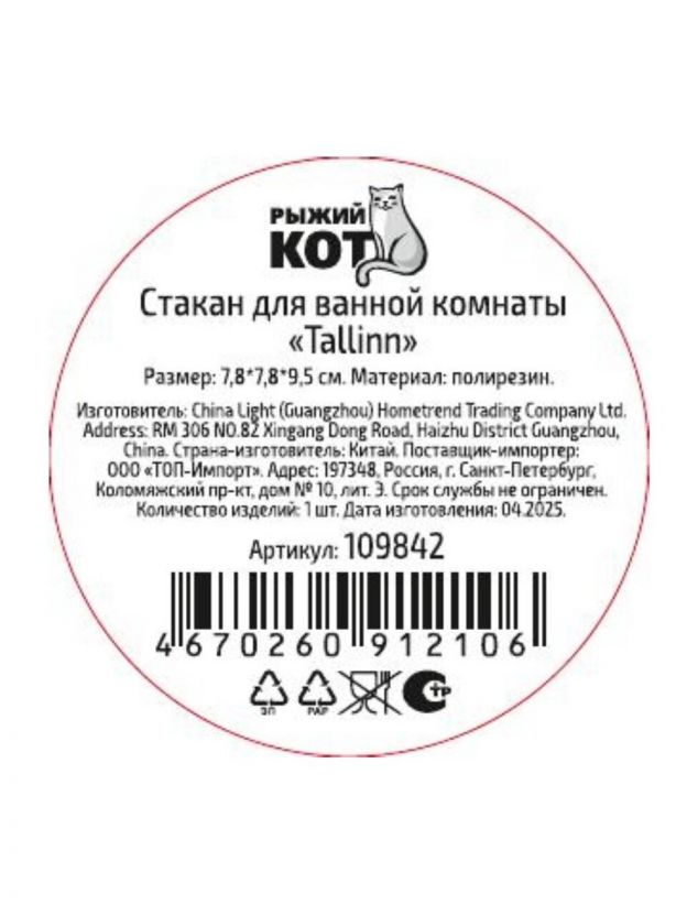 Стильный стакан для ванной Рыжий кот Tallin подчеркнет современный интерьер и обеспечит удобство хранения аксессуаров. Компактные размеры 7.8х7.8х9.5 см позволяют экономить место и поддерживать порядок в ванной комнате. Прочный полирез гарантирует долговечность и легкость ухода. Отличное решение для организации пространства и создания уюта.
