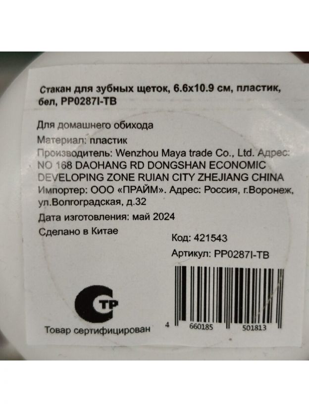 Стакан для зубных щеток, 6.6х10.9 см, пластик, белый, PP0287I-TB