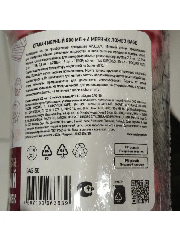 Стакан мерный 0.5 л, 6 мерных ложек, в ассортименте, Apollo, Gage, GAG-50