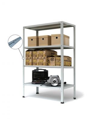 Стеллаж является разрезным, стойки полки собираются из двух частей, и имеют крепление в центре, такие стеллажи более компактны при хранении в разобранном виде.