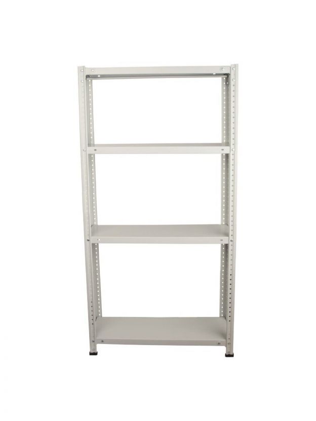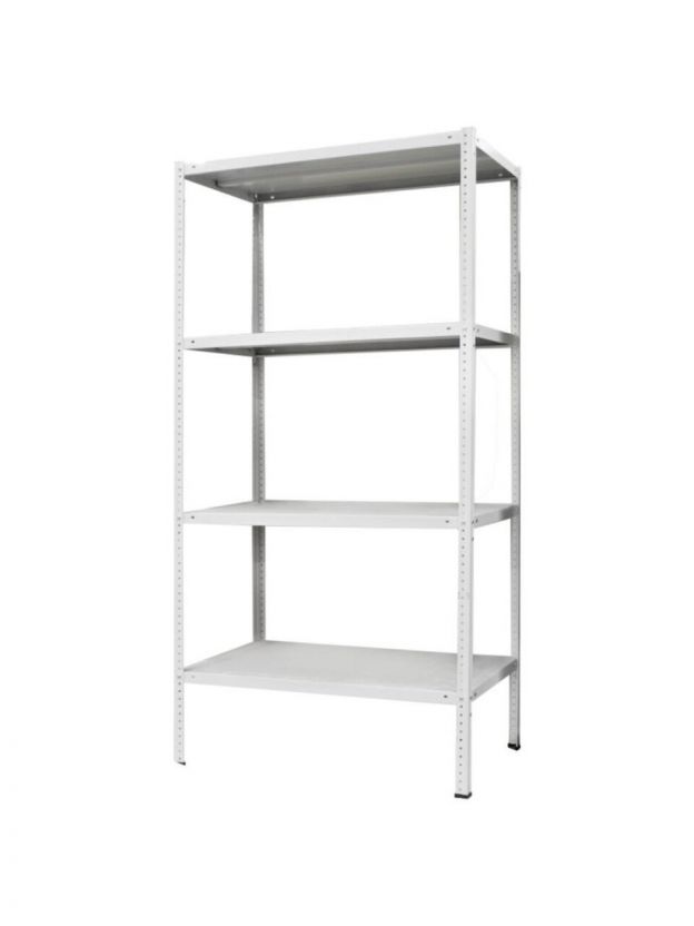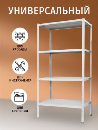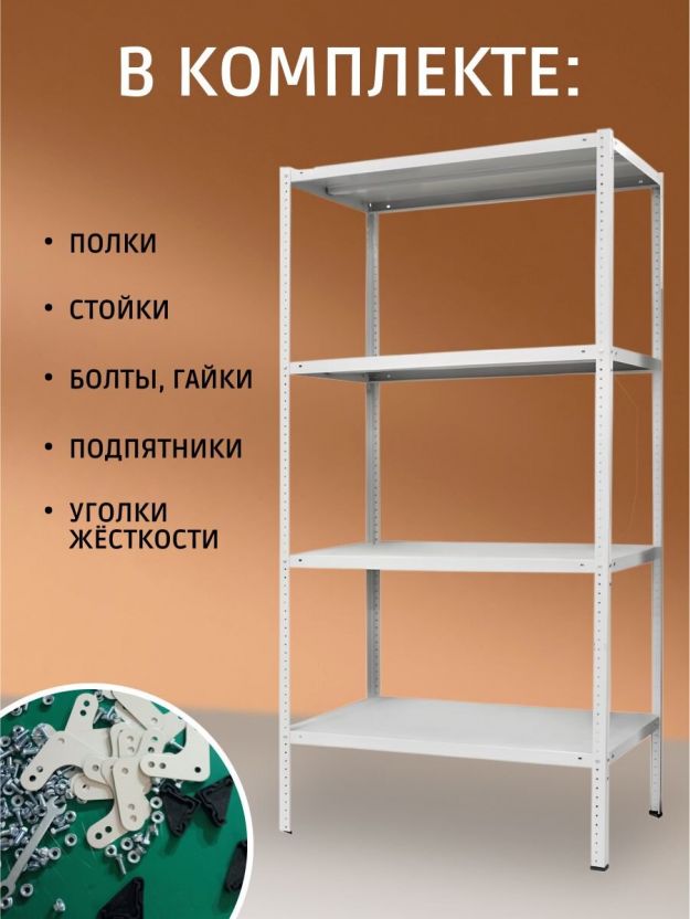 Стеллаж поставляется в разобранном виде и укомплектован 4-мя металлическими стойками, 4-мя металлическими полками и необходимым крепежом для сборки.