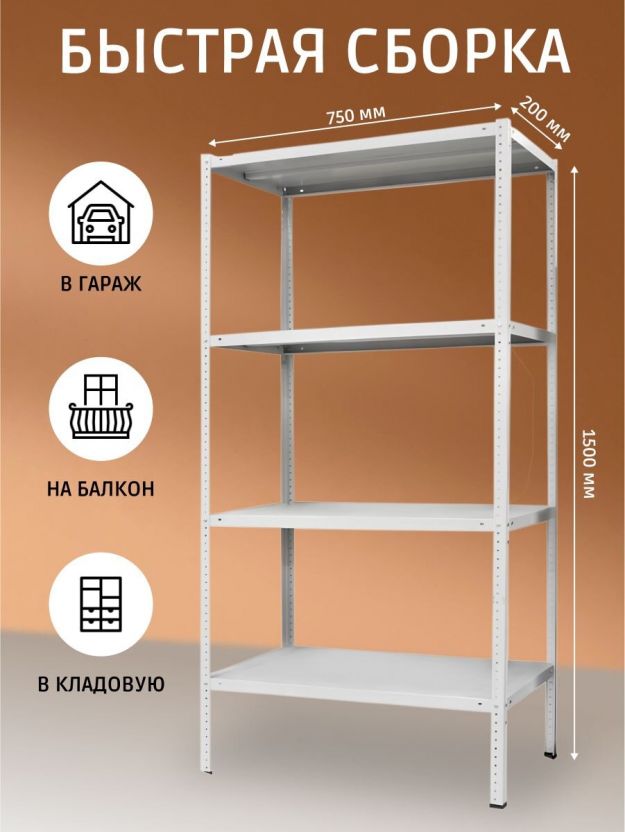 • Комплектация: 4 стойки 1500 мм (неразборные), 4 полки 200х750 мм, крепеж, пластиковые подпятники.