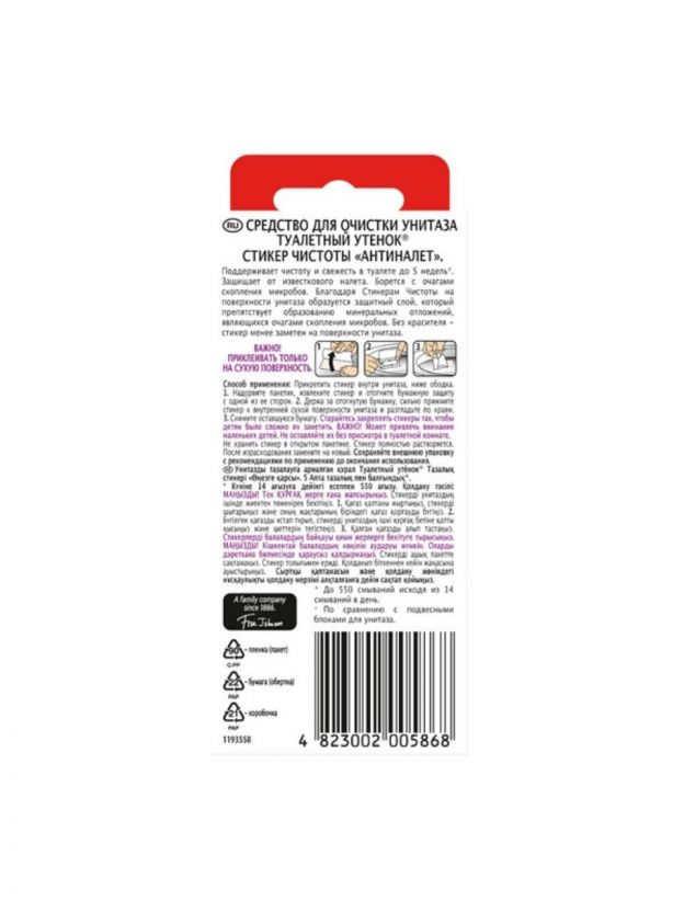 Приклеивайте только на сухую поверхность. Прикрепите полоску внутри унитаза ниже ободка. Надорвите пакетик, извлеките стикер и отогните бумажную защиту с одной из ее сторон. Держа за отогнутую бумажку, сильно прижмите стикер к внутренней сухой поверхности унитаза и разгладьте по краям. Снимите оставшуюся бумагу. Старайтесь закрепить стикеры так, чтобы детям было сложно их заметить. Стикер полностью растворяется. После использования замените на новый.