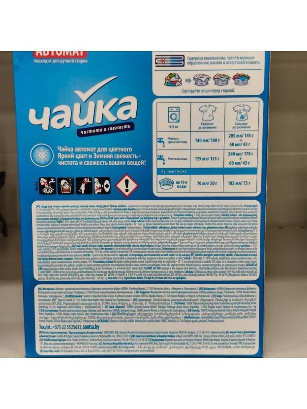 Стиральный порошок Чайка Яркий цвет и зимняя свежесть автомат хорошо отстирывает основные виды загрязнений, сохраняет яркость цвета вещей и придает легкий аромат зимней свежести. Без фосфатов.