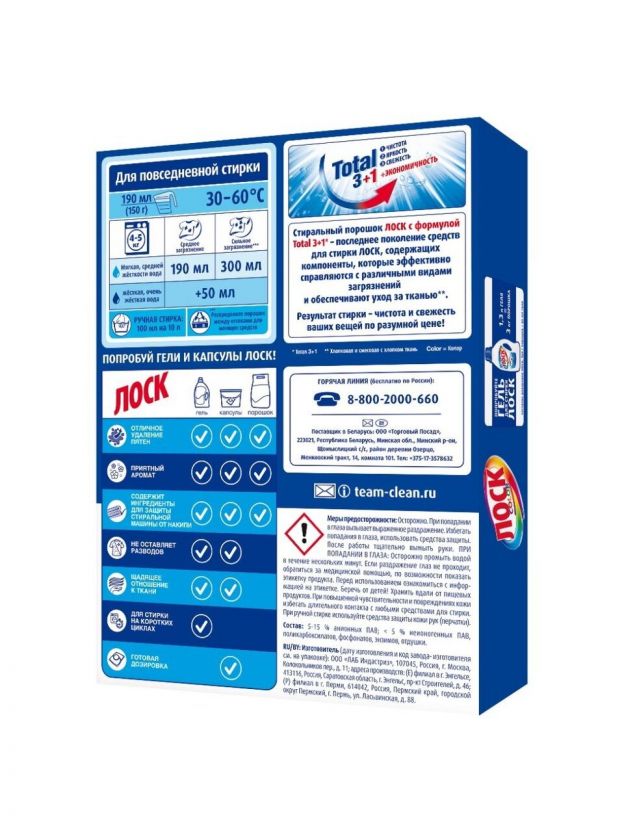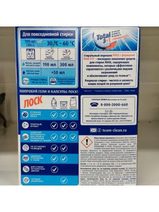 Стиральный порошок Лоск с формулой Total 3+1 - последнее поколение средств для стирки Лоск, содержащих компоненты, которые эффективно справляются с различными видами загрязнений и обеспечивают уход за тканью. Результат стирки - чистота и свежесть ваших вещей по разумной цене!