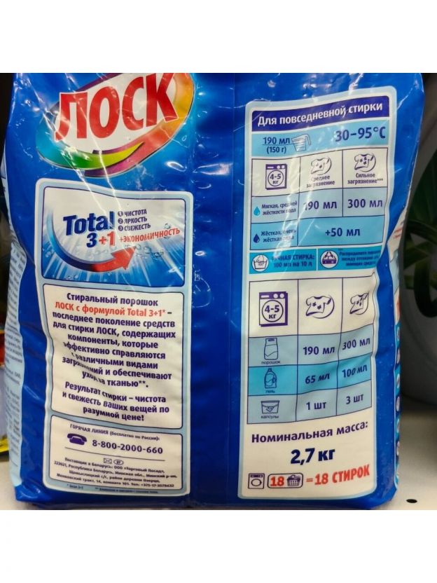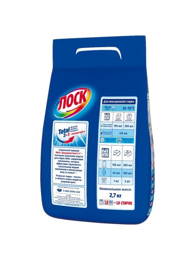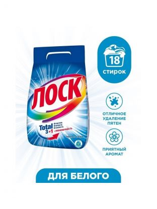 Стиральный порошок Лоск с формулой Total 3+1 - последнее поколение средств для стирки Лоск, содержащих компоненты, которые эффективно справляются с различными видами загрязнений и обеспечивают уход за тканью. Результат стирки - чистота и свежесть ваших вещей по разумной цене!