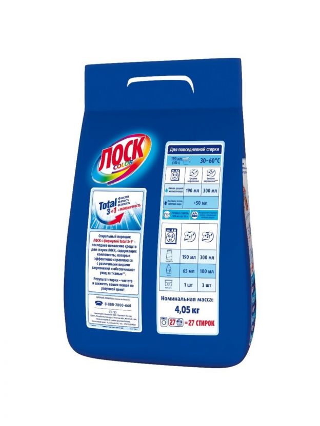 Стиральный порошок Лоск с формулой Total 3+1 - последнее поколение средств для стирки Лоск, содержащих компоненты, которые эффективно справляются с различными видами загрязнений и обеспечивают уход за тканью. Результат стирки - чистота и свежесть ваших вещей по разумной цене!