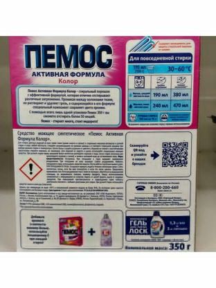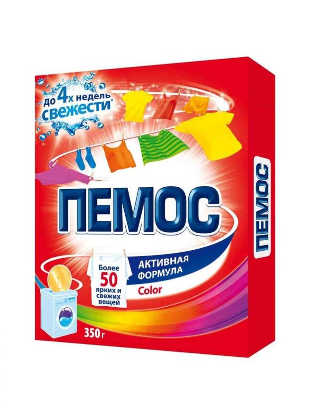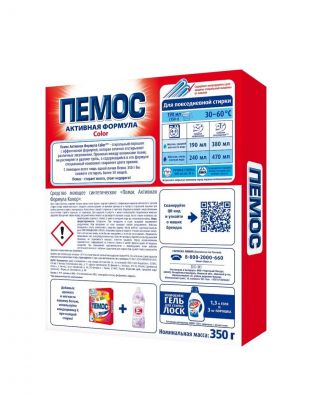 Пемос Активная Формула - стиральный порошок с эффективной формулой, которая отлично отстирывает различные загрязнения. Проникая между волокнами ткани, он растворяет и удаляет грязь, а содержащийся в его формуле специальный компонент сохраняет цвета яркими. С помощью всего лишь одной пачки Пемос 350 г Вы сможете отстирать более 50 вещей. Пемос – стирает много, стоит недорого! Для стирки цветных изделий из х/б, льняных, синтетических тканей и тканей из смешанных волокон в стиральных машинах-автоматах и ручной стирки в воде любой жесткости. Следуйте рекомендациям на ярлыках одежды и в паспорте стиральной машины при выборе режима стирки и температуры. Белое белье стирайте отдельно от цветного. Изделия из тканей с неустойчивыми красителями стирайте отдельно, не замачивая. Для изделий из шерсти и шелка используйте специальные моющие средства. При ручной стирке перед загрузкой белья полностью растворите порошок в воде, после стирки несколько раз прополощите изделие в теплой, а затем в холодной воде до исчезновения пены.Для стирки цветных изделий из х/б, льняных, синтетических тканей и тканей из смешанных волокон в стиральных машинах-автоматах и ручной стирки в воде любой жесткости. Состав: 5-15 % анионных ПАВ; 5%
