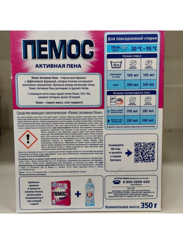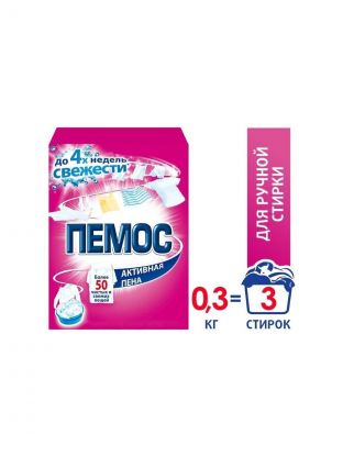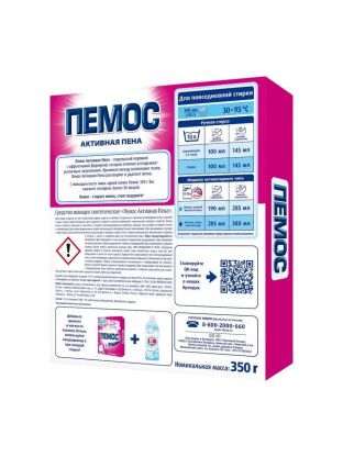 Пемос Активная Пена - стиральный порошок с эффективной формулой, которая отлично отстирывает различные загрязнения. Проникая между волокнами ткани, Пемос Активная Пена растворяет и удаляет пятна.. С помощью всего лишь одной пачки Пемос 350 г Вы сможете отстирать более 50 вещей. Пемос – стирает много, стоит недорого! Для стирки изделий из х/б, льняных, синтетических тканей и тканей из смешанных волокон в стиральных машинах активаторного типа и ручной стирки в воде любой жесткости. Для изделий из шерсти и шелка используйте специальные моющие средства. Белое бельё стирайте отдельно от цветного. Следуйте рекомендациям на ярлыках одежды при выборе условий стирки и температуры. Для сильнозагрязненных вещей рекомендуется предварительное замачивание. При замачивании / ручной стирке перед загрузкой белья полностью растворите порошок в воде, после стирки несколько раз прополощите изделие в теплой, а затем в холодной воде до исчезновения пены. Состав: 5-15 % анионных ПАВ; 5%