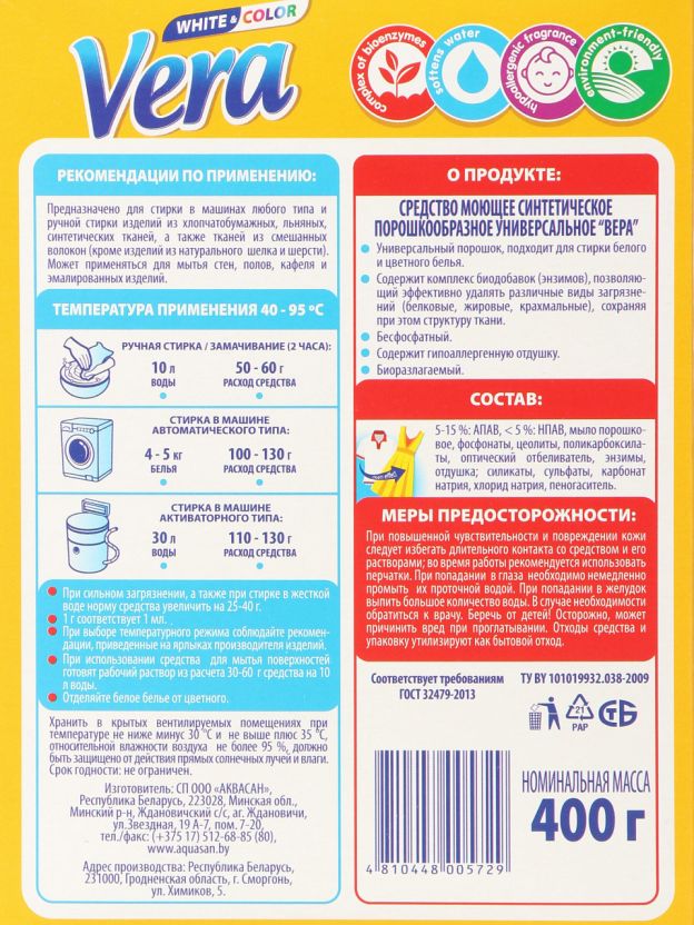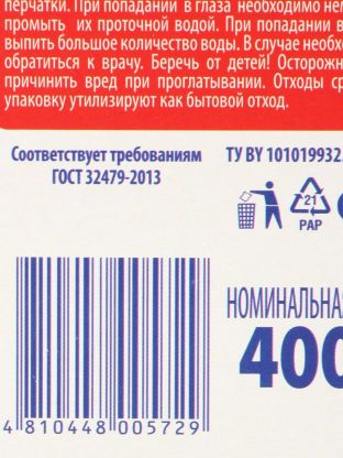 Вес — 0.4 кг, упаковка — картонная коробка, аромат — свежесть, страна продавца — Беларусь, подходит для автоматической и ручной стирки.