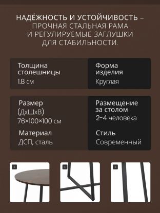 Сочетание стали и ДСП в конструкции стола гарантирует долговечность и прочность, что делает его идеальным выбором для повседневного использования. Коричневый цвет столешницы придаёт изделию элегантность, а металлические ножки обеспечивают устойчивость и надежность. Этот стол станет идеальным решением для тех, кто ценит стиль и практичность в интерьере.