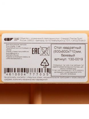 Стол пластик, Стандарт Пластик Групп, 80х80х71 см, квадратный, пластиковая столешница, бежевый