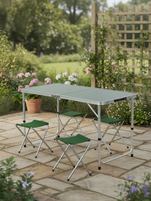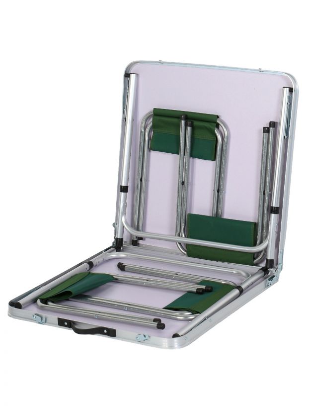 - Всё в комплекте — стол-чемодан и 4 складных стула для быстрой организации отдыха.