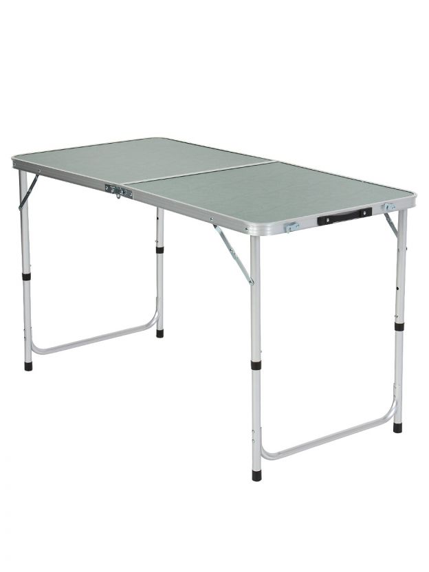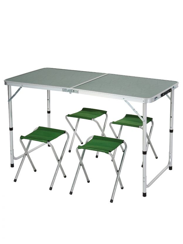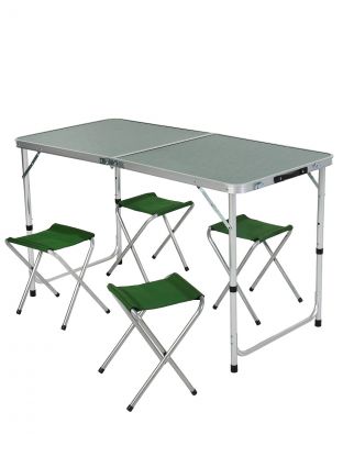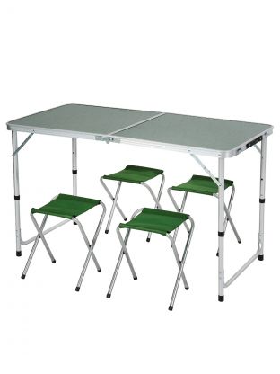 Размеры стола: 120х60х70 см, форма — прямоугольная, материал — металл, цвет — зелёный. В комплекте 4 складных стула, всего 6 посадочных мест.