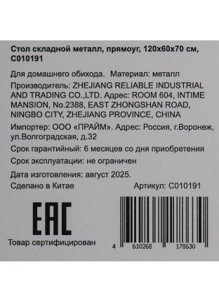 Стол складной 120х60х70 см, прямоугольный, металл, столешница МДФ, C010191