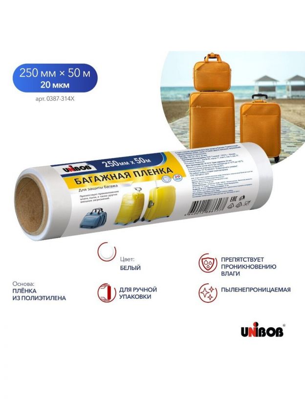 Стрейч-пленка багажная Unibob 250 мм — идеальное решение для надежной ручной упаковки багажа и защиты вещей от пыли и влаги. Прочная пленка из первичного сырья толщиной 20 мкм обеспечивает высокую эластичность и плотное прилегание. Легко использовать, удобно брать в дорогу. Экономия времени и уверенность в сохранности содержимого — выгодный выбор для путешествий и хранения.