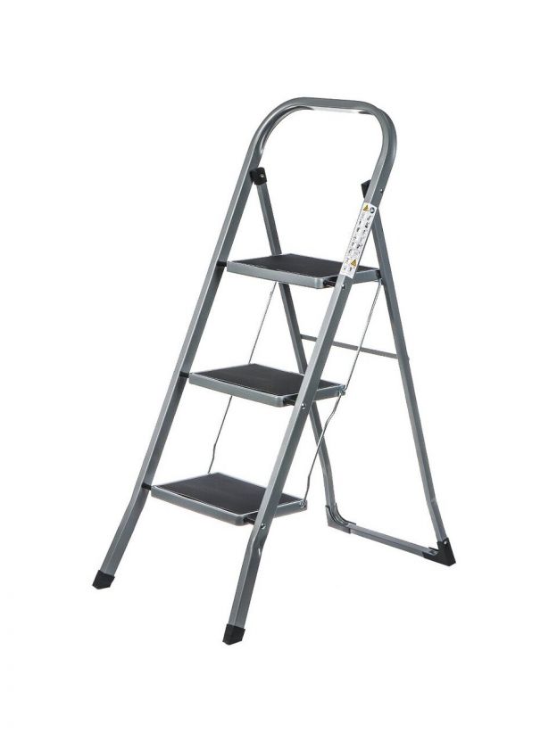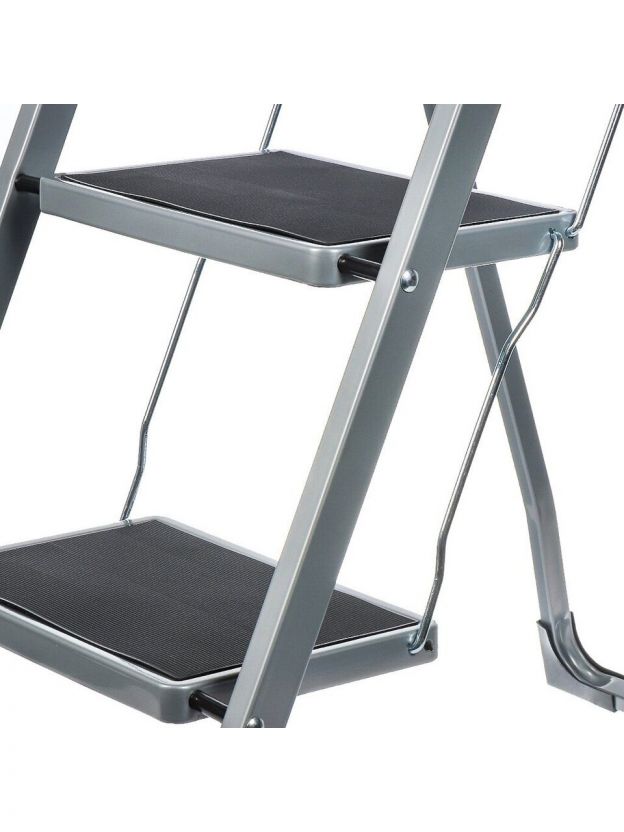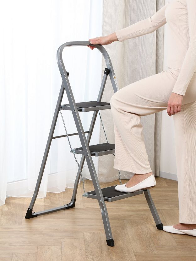 • Стремянка имеет две ступени, что делает ее удобной для выполнения работ на разных высотах. Вы можете легко достать до высоких полок, заменить лампочку или выполнить другие работы, не используя дополнительные инструменты.