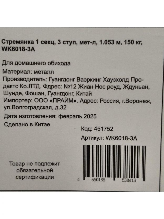 Стремянка 1 секция, 3 ступени, металл, 1.053 м, 150 кг, WK6018-3A