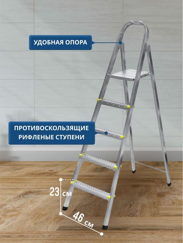 - Стремянка изготовлена из высококачественного сырья, что обеспечивает ее долговечность и надежность.