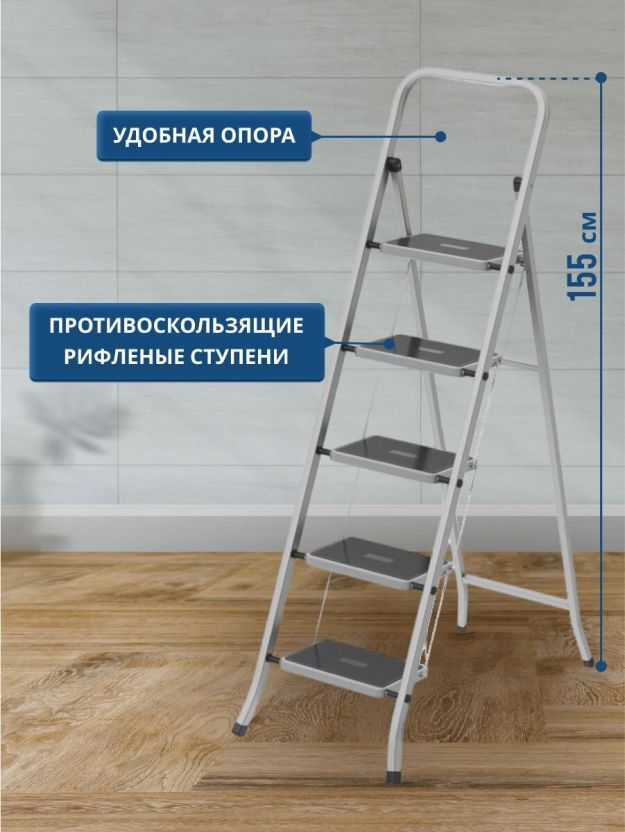 Стремянка выполнена из прочной стали, что обеспечивает ее долговечность и надежность. Она выдерживает до 120 кг. веса, что позволяет использовать ее для различных задач. Кроме того, на ступенях имеются противоскользящие накладки, которые обеспечивают безопасность во время работы. Стремянка также имеет удобные ручки для переноски и складывания, что делает ее легкой в транспортировке и хранении. Между ступенями стремянки имеются ограничители, которые фиксируют стремянку в разложенном виде.