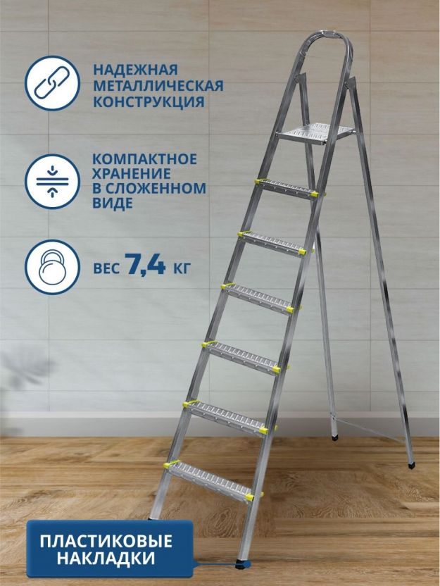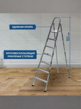 - Рабочая высота 7 ступени стремянки ( от пола до площадки в разложенном виде) составляет: 154 см.