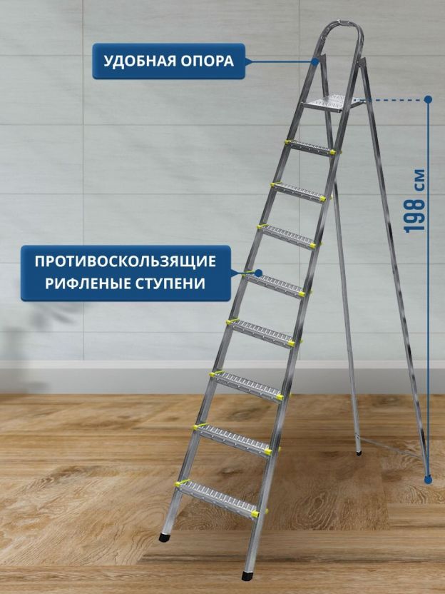 - 9 широких металлических ступеней, обеспечат удобство и безопасность подъема и спуска.