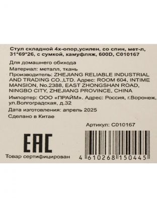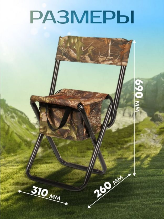 Стул складной 4х - опорный, усиленный, со спинкой, металл, 31х69х26 см, с сумкой, 600D, камуфляж, C010167