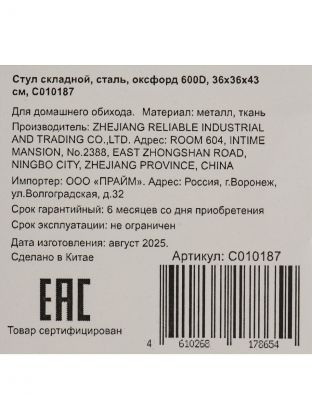 Складной стул 36х36х43 см с каркасом из стали и сиденьем из плотного оксфорда 600D — отличный вариант для тех, кто ищет купить недорого стул для дачи, рыбалки или отдыха на природе. Благодаря компактным размерам и лёгкому весу, его удобно брать с собой в поездки, использовать на балконе или хранить в кладовой. Стальная конструкция обеспечивает устойчивость и долгий срок службы, а материал сиденья не боится влаги и легко очищается.