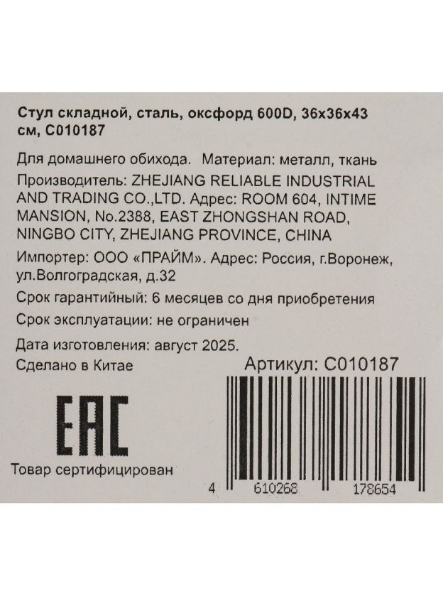 Стальная рама и прочный оксфорд 600D рассчитаны на среднюю нагрузку до 100 кг, что делает стул безопасным для большинства пользователей.