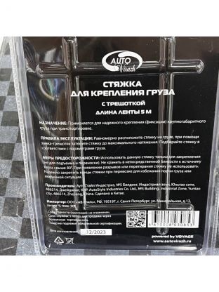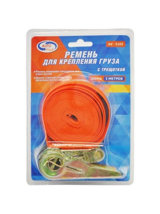 Стяжка для груза Autovirazh AV-5105 это стяжка для груза с храповым замком. Длина стяжки 5 метров. Данная модель редназначена для фиксации груза при транспортировке. Ширина ленты - 25 мм.