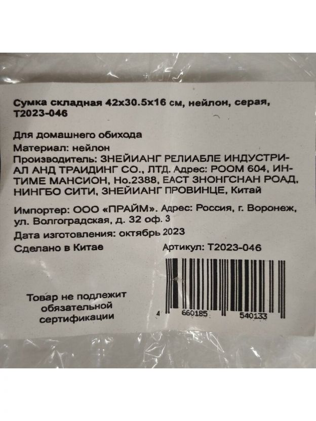 Сумка складная 42х30.5х16 см, нейлон, серая, T2023-046