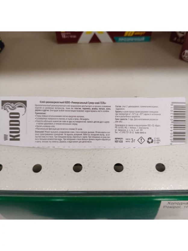 Супер клей KUDO, цианакрилатный, универсальный, водостойкий, однокомпонентный, 3 г, KBT-020, Гель