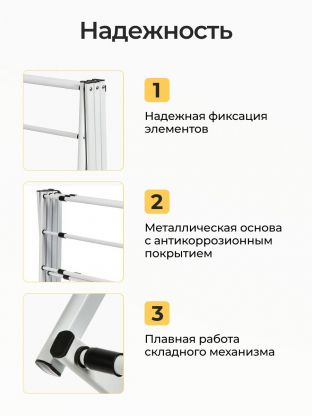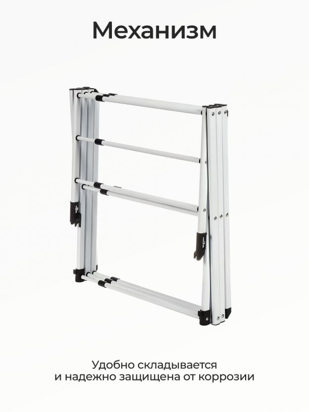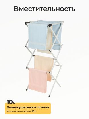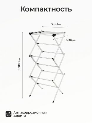 Габариты: 75х39х100 см, рабочая длина для развешивания белья — 10 м. Подходит для сушки одежды, постельного белья и полотенец.