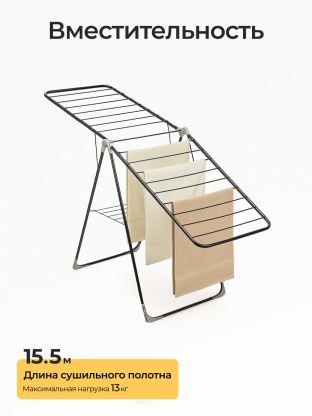 У этой модели 16 прутьев, рабочая длина 15,5 м и створки, что увеличивает полезную площадь и позволяет сушить больше вещей в компактном пространстве.