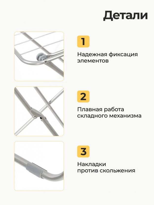 Да, благодаря складной конструкции и размерам 180х50х105 см сушилка легко помещается даже в ограниченном пространстве. В сложенном виде занимает минимум места, удобно хранить за дверью или в шкафу.