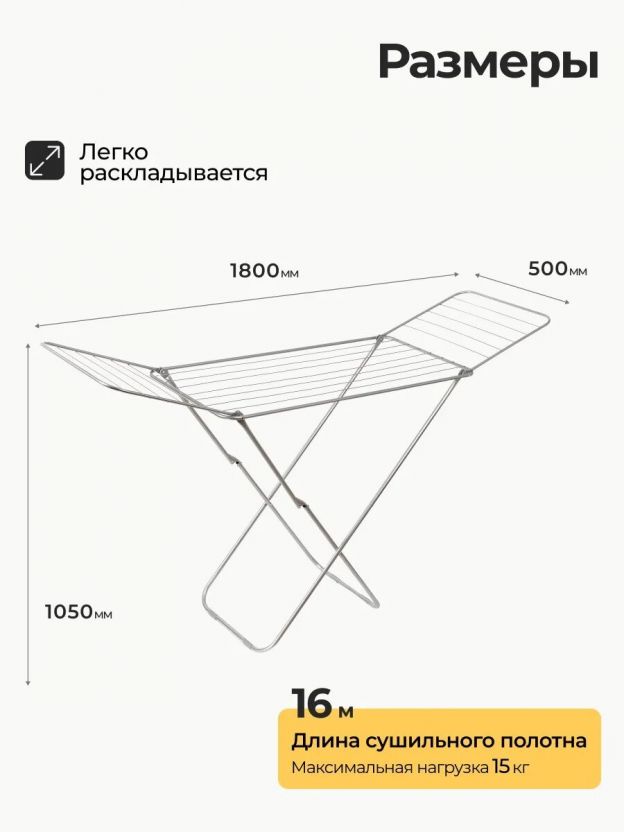 Длина — 180 см, ширина — 50 см, высота — 105 см. Рабочая длина полотна — 16 метров, вес — всего 1,9 кг. Это оптимально для сушки большого объёма белья дома или на даче.