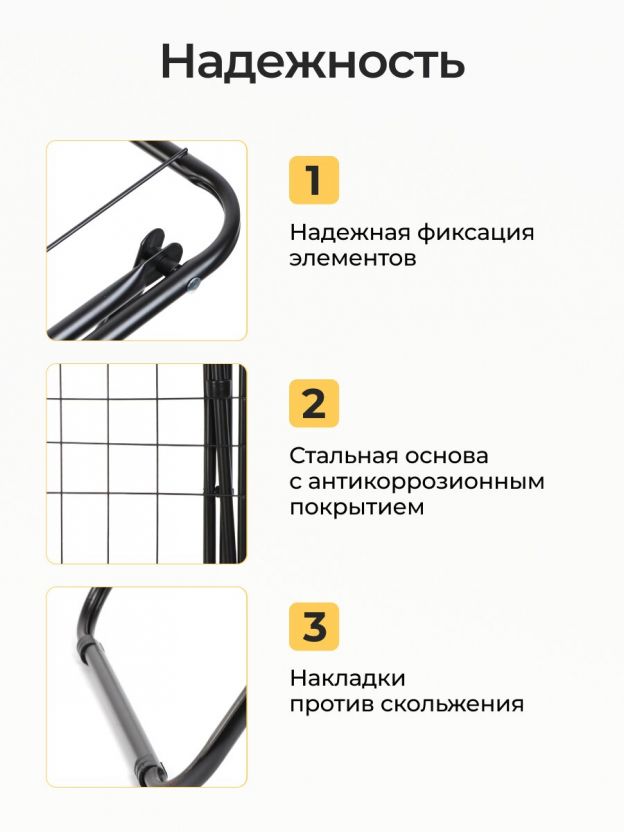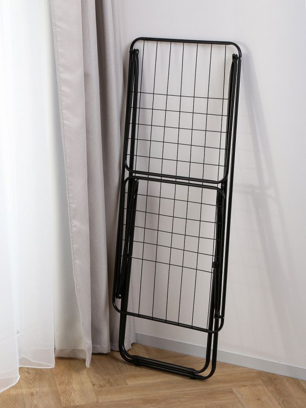 Складная металлическая сушилка рассчитана на максимальную нагрузку до 16 кг — это позволяет сушить даже тяжелое постельное белье и большие объемы одежды одновременно.