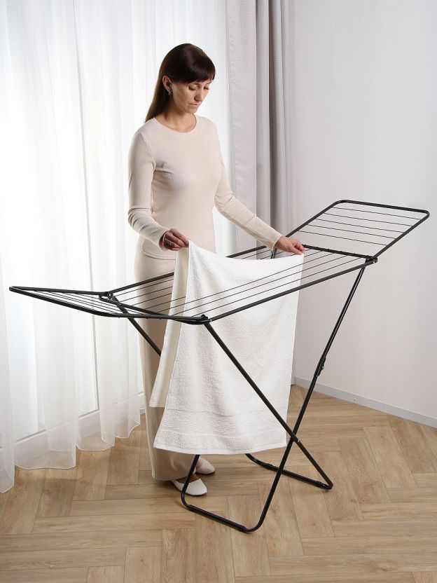 Экономия пространства: складная сушилка легко убирается после использования, не занимает много места в квартире или на балконе