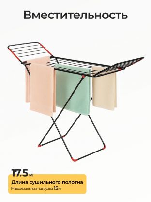 Вместительная — 17,5 м полотна и 18 прутьев, выдерживает до 15 кг, подходит для сушки постельного белья и одежды.