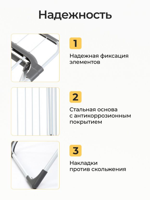 Да, благодаря 24 металлическим прутьям и максимальной нагрузке до 18 кг вы сможете сушить крупные и тяжелые вещи без риска деформации конструкции.