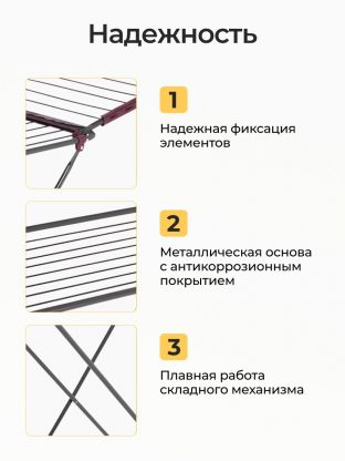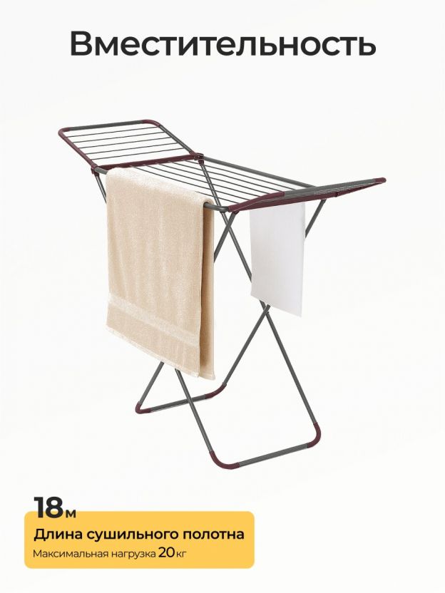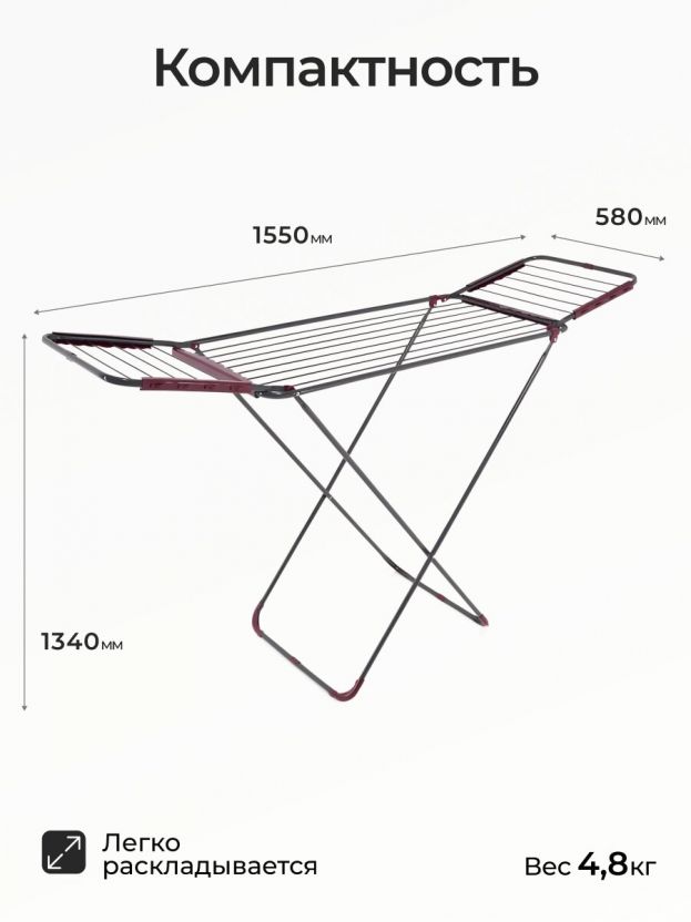 Габариты в разложенном виде: 155х58х134 см, рабочая длина — 18 метров, 18 прутьев. Это оптимально для сушки белья после одной-двух стирок или крупных вещей.