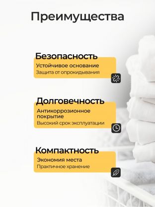 Складная напольная конструкция не требует монтажа, легко перемещается и быстро складывается для хранения. Подходит для временного и постоянного использования в любых помещениях — от городской квартиры до дачного дома.