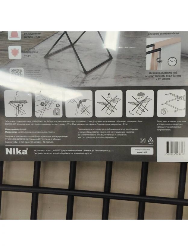 Сушилка для белья напольная Nika 18 м — максимум белья, минимум места: складная конструкция, выдерживает до 15 кг, идеальна для дома и дачи. Почему выбирают: 18 прутьев и рабочая длина 18 м — сушите объёмные вещи за один раз, экономя время и пространство Металлическая складная конструкция 177х53.5х111.5 см — прочность, устойчивость, длительный срок службы Удобна для квартиры, загородного дома и в подарок — компактно складывается, легко переносится Сушилка для белья напольная Nika 18 м — это оптимальный выбор для тех, кто ищет вместительную и надёжную сушилку для квартиры, дачи или временного жилья. Благодаря складной металлической конструкции и 18 прочным прутьям вы сможете разместить до 15 кг белья: постельное, полотенца, детские вещи. Часто спрашивают, как выбрать сушилку для большого объёма белья — обратите внимание на длину полотна и количество прутьев: у данной модели они одни из лучших в классе. Сравнивая с аналогами, эта модель выгодно отличается компактностью в сложенном виде и возможностью размещать вещи на створках — удобно для сушки деликатных тканей и крупных предметов. Если вы ищете, какую напольную сушилку выбрать для дома или дачи, обратите внимание на устойчивую конструкцию и защиту от коррозии: металлические элементы прослужат не один сезон. Часто спрашивают, подходит ли она для больших простыней или одеял — да, благодаря длине и ширине вы сможете разместить даже габаритные вещи. Сделайте заказ прямо сейчас — получите современную сушилку для белья с быстрой доставкой и гарантией качества от проверенного бренда Nika. Успейте купить недорого напольную сушилку для дачи или квартиры — количество товара ограничено. Частые вопросы: Какую нагрузку выдерживает сушилка для белья Nika 18 м? Максимальная нагрузка — до 15 кг. Это позволяет сушить сразу несколько комплектов постельного белья, полотенца и одежду без риска деформации конструкции. Подходит ли эта модель для маленьких помещений? Да, складная конструкция позволяет легко убирать сушилку после использования. В сложенном виде она занимает минимум места, что удобно для хранения в шкафу или за дверью. Каковы размеры и материал основания у данной сушилки? Габариты в разложенном виде — 177х53.5х111.5 см. Основание и перекладины выполнены из прочного металла с защитой от влаги и коррозии.