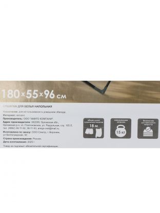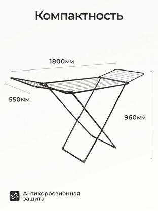 Габариты: длина 180 см, ширина 55 см, высота 96 см. Рабочая длина для размещения белья — 18 метров, количество прутьев — 18, максимальная нагрузка — 15 кг.