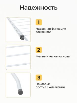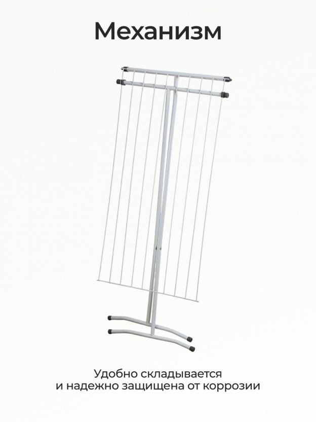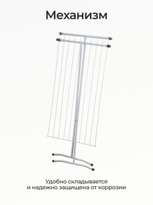 Часто спрашивают, чем отличается эта модель от аналогов: здесь нет механизма «гармошка», что делает конструкцию более простой и надёжной. Если вы ищете, как использовать напольную сушилку для белья максимально эффективно — достаточно разложить её, развесить вещи на 10 прутьях, а после сушки быстро сложить и убрать. Подходит ли для сушки постельного белья? Да, за счёт длины и прочности эта модель справится с полотенцами, простынями и даже лёгкими одеялами.