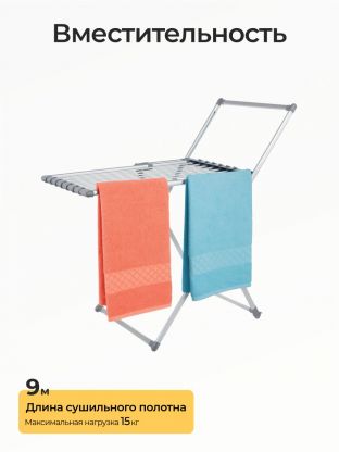 Рабочая длина 9 метров позволяет разместить до 2 полных загрузок стандартной стиральной машины или крупные вещи (простыни, полотенца). Максимальная нагрузка — 15 кг.