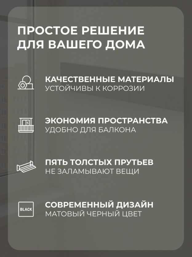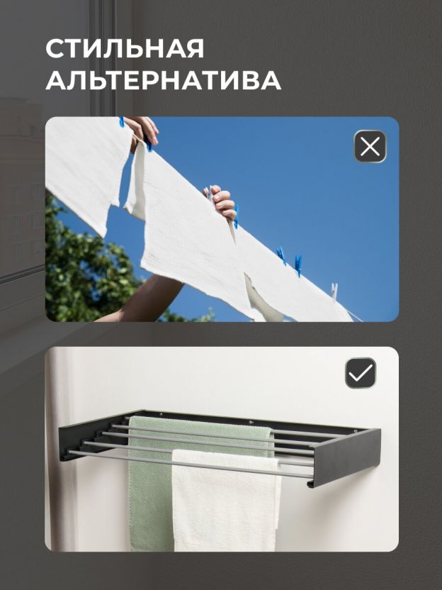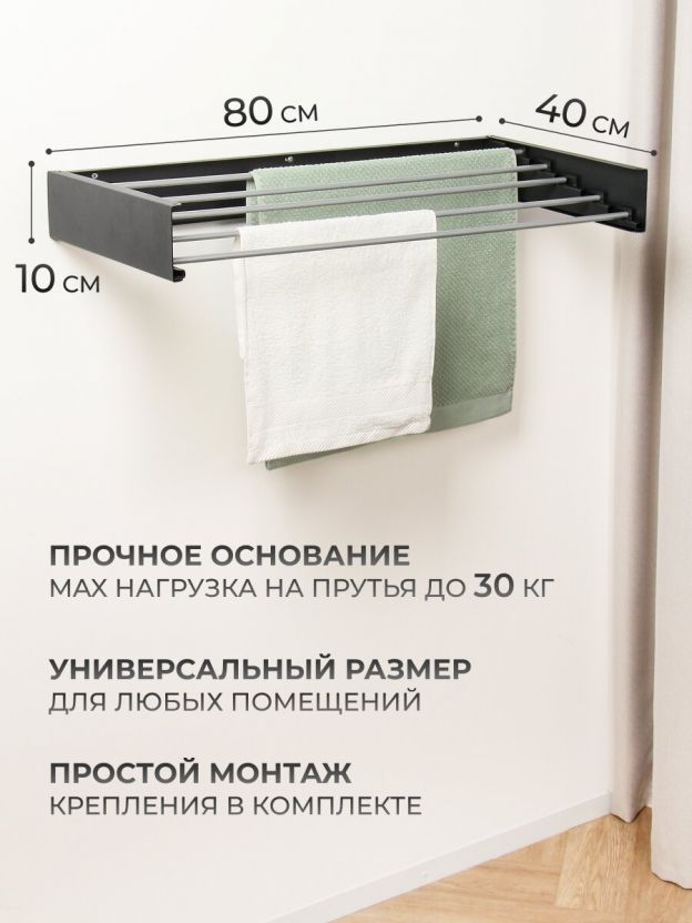 Настенная сушилка для белья 80 см, 5 прутьев, черная — компактное решение для балкона и дома: экономьте место, сушите до 2 кг белья одновременно.